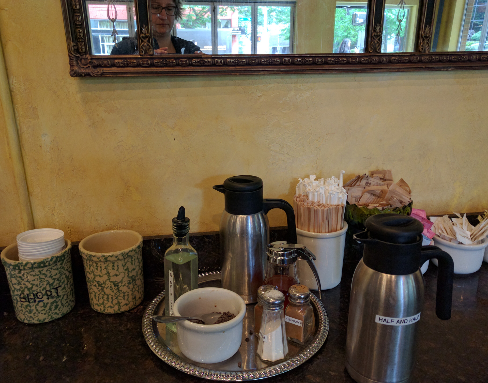 Der Schaum war wirklich delikat. Jeder Gast kann (wie in den USA so üblich) seinen Kaffee oder Tee an der Theke „personalisieren“: Zucker, Milch, Zimt, Schokoladenpulver, häufig Muskatnuss und Vanillezucker und hier sogar Schokoladendrops stehen bereit.